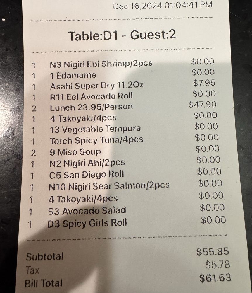 in:california rolltop;bake salmon &kani,avocado,spicy mayo and eel sauce